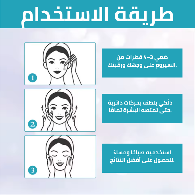 1- ضعي 3–4 قطرات من السيروم على وجهك ورقبتك.
